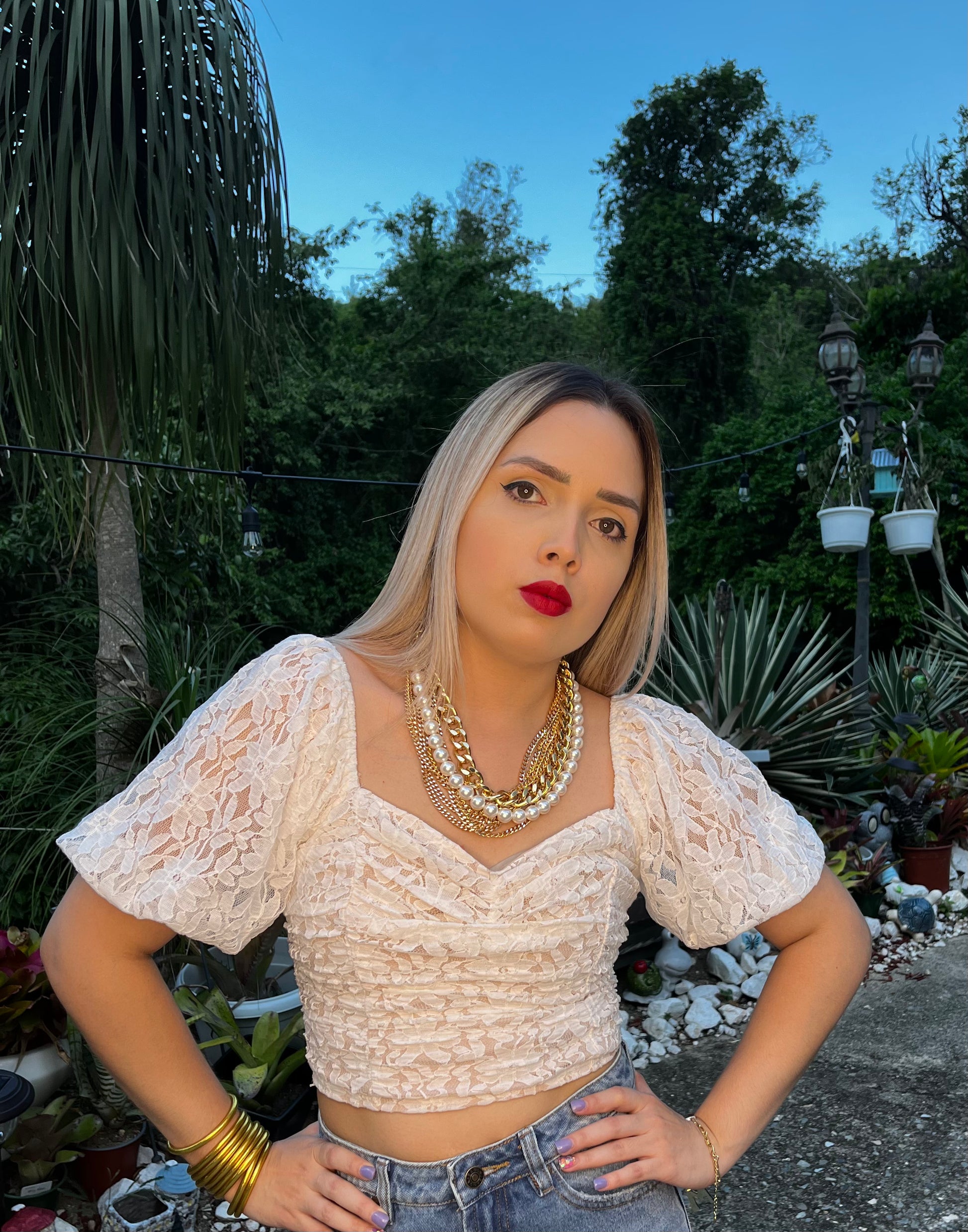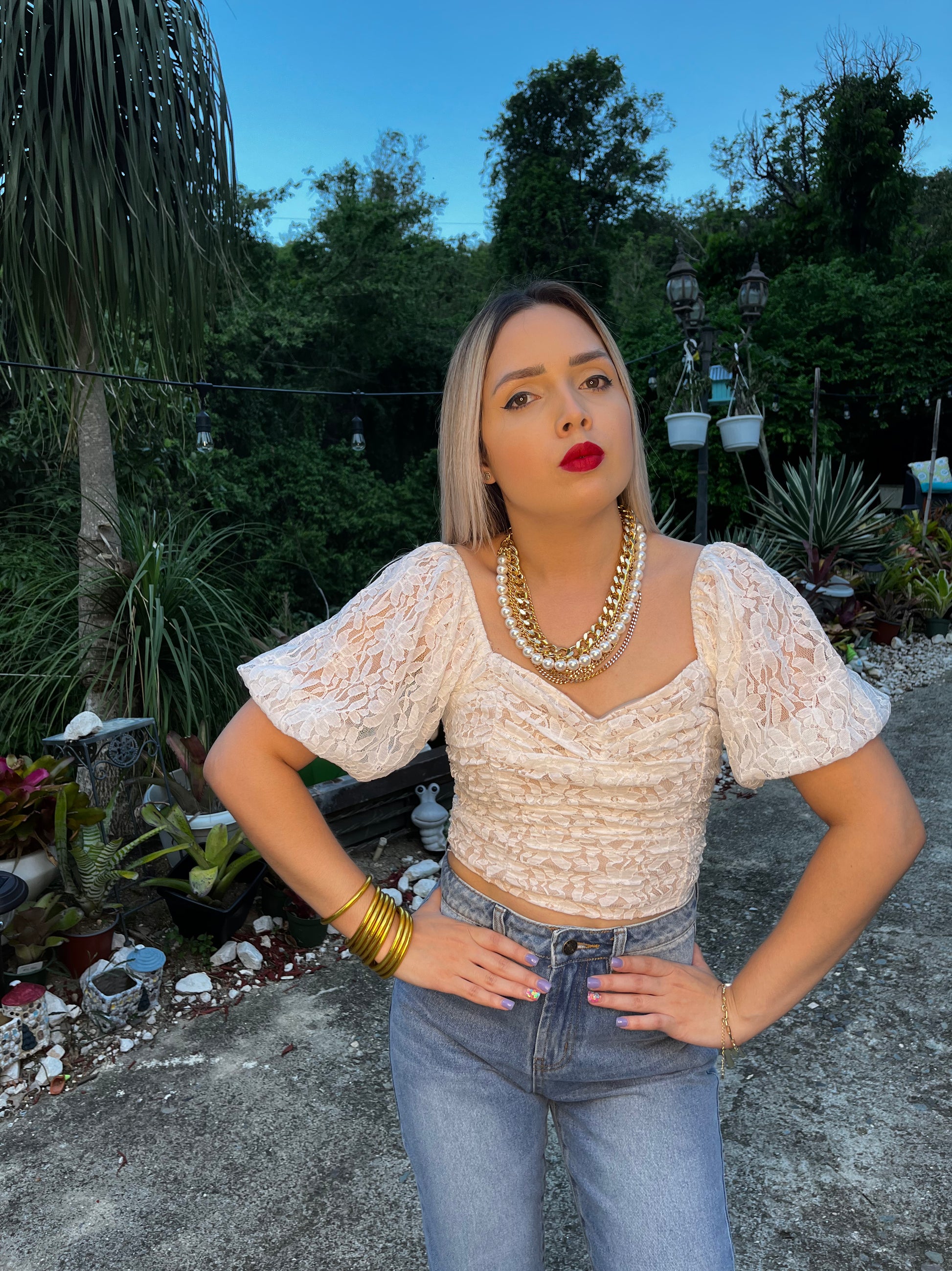 Camisa cremosa en lace. Mangas en globo y zipper en la espalda. Corre pequeña. Modelo usa Small.
